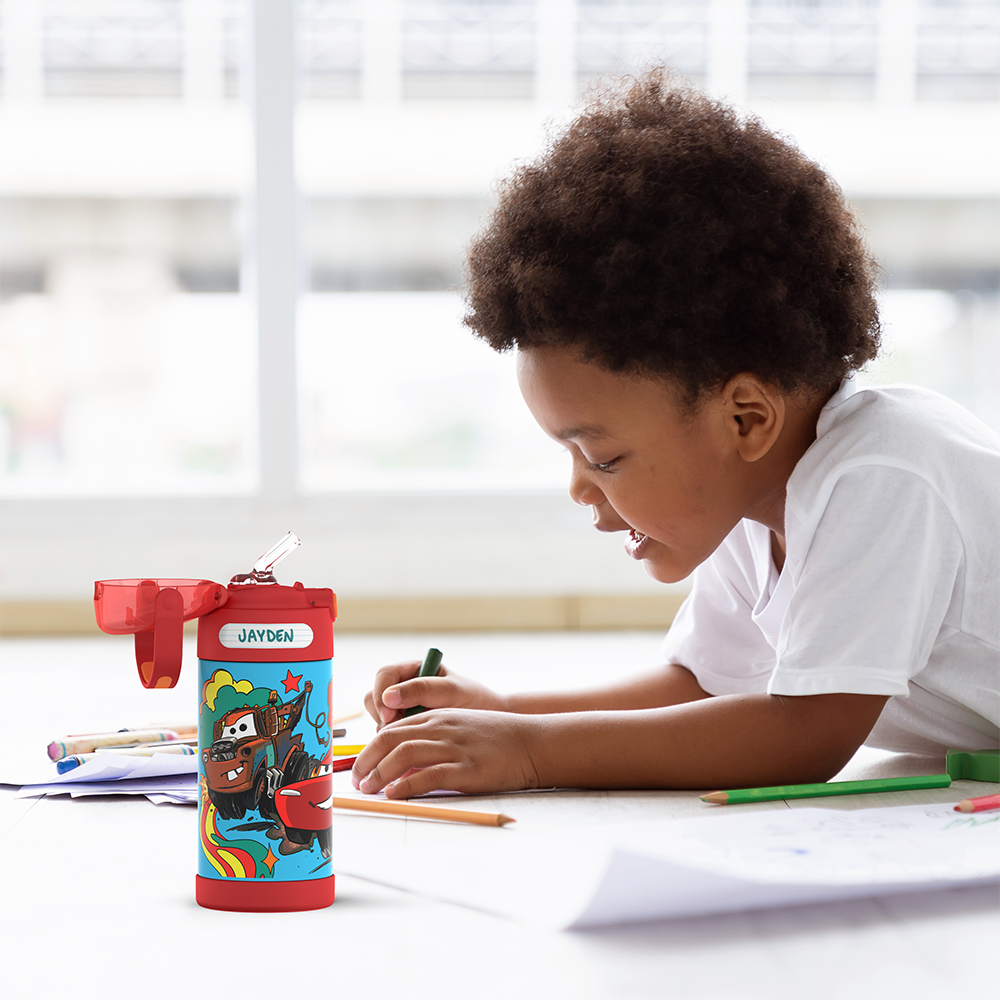 The FUNtainer? 12oz Vacuum Insulated Stainless Steel Water Bottle with Straw keeps drinks cold for up to 12 hours. The double wall stainless steel construction is built to handle drops. dings and assorted roughhousing. Includes an integrated carry handle with soft-touch grip. making it easy for kids to carry with them throughout the day. Help keep germs away with the hygienically covered silicone straw which is removable for easy cleaning. To clean. you can pop your FUNtainer water bottle in the dishwasher; however hand washing is recommended. Not for use with hot liquids. Customize your FUNtainer bottle with adhesive name labels that can be firmly adhered to any FUNtainer product. Two peel and stick labels are included inside this FUNtainer product. Fun for the kids. and easy for the parents. Just write. peel and stick!
