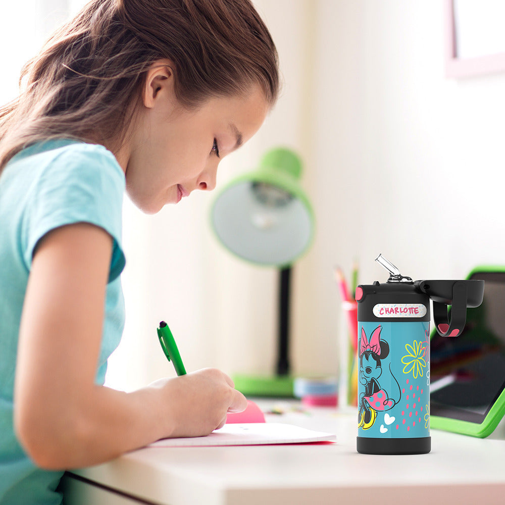 The FUNtainer? 12oz Vacuum Insulated Stainless Steel Water Bottle with Straw keeps drinks cold for up to 12 hours. The double wall stainless steel construction is built to handle drops. dings and assorted roughhousing. Includes an integrated carry handle with soft-touch grip. making it easy for kids to carry with them throughout the day. Help keep germs away with the hygienically covered silicone straw which is removable for easy cleaning. To clean. you can pop your FUNtainer water bottle in the dishwasher; however hand washing is recommended. Not for use with hot liquids. Label your FUNtainer bottle with adhesive name stickers that can be firmly adhered to any FUNtainer product. Two peel and stick labels are included inside this FUNtainer product. Fun for the kids. and easy for the parents. Just write. peel and stick!