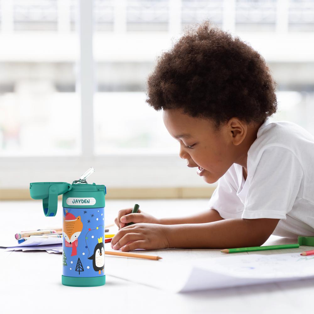 The FUNtainer? 12oz Vacuum Insulated Stainless Steel Water Bottle with Straw keeps drinks cold for up to 12 hours. The double wall stainless steel construction is built to handle drops. dings and assorted roughhousing. Includes an integrated carry handle with soft-touch grip. making it easy for kids to carry with them throughout the day. Help keep germs away with the hygienically covered silicone straw which is removable for easy cleaning. To clean. you can pop your FUNtainer water bottle in the dishwasher; however hand washing is recommended. Not for use with hot liquids. Label your FUNtainer bottle with adhesive name stickers that can be firmly adhered to any FUNtainer product. Two peel and stick labels are included inside this FUNtainer product. Fun for the kids. and easy for the parents. Just write. peel and stick!