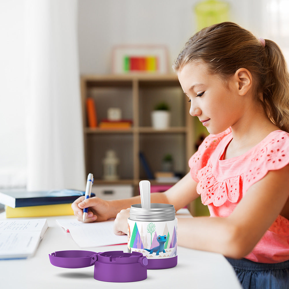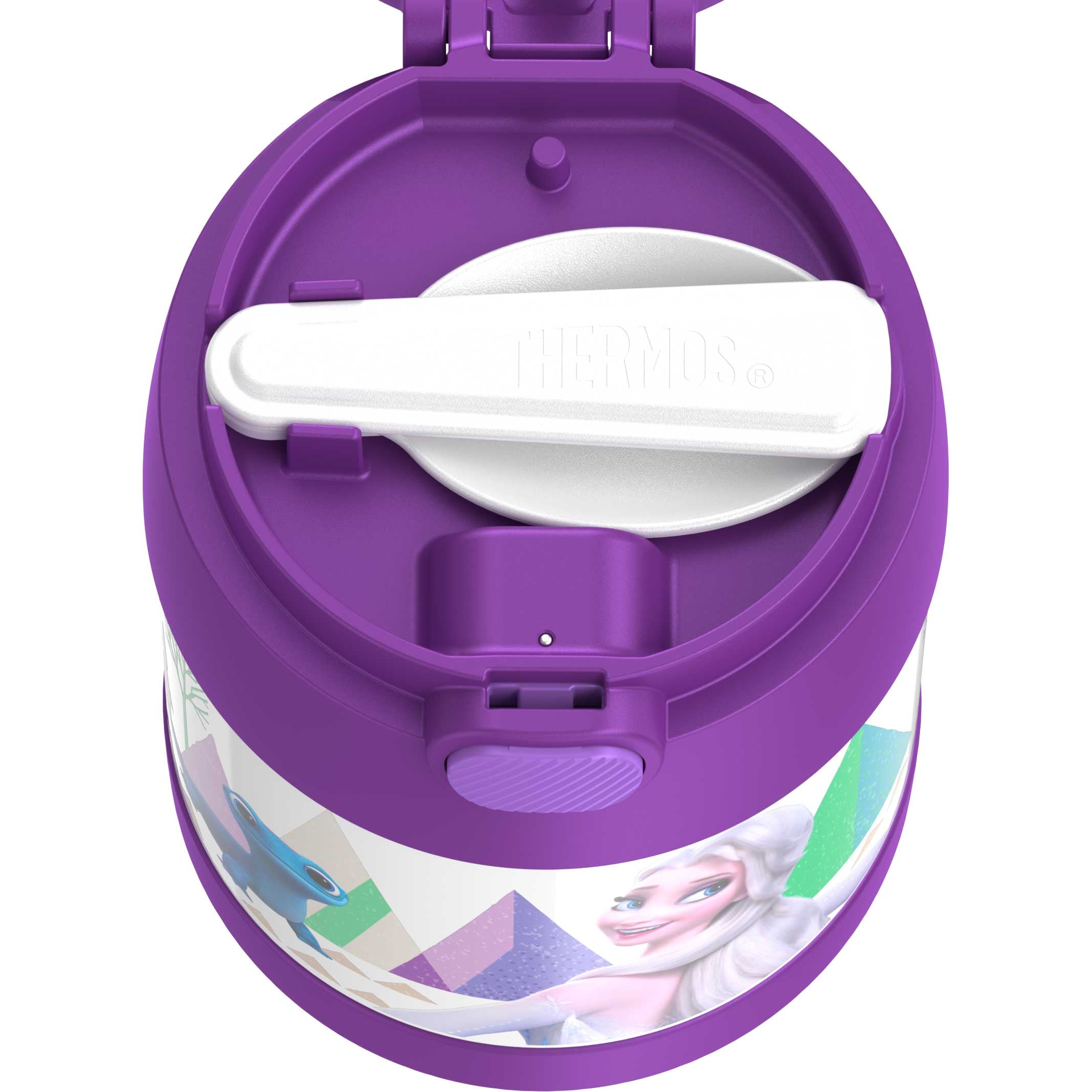 The 10oz FUNtainer? Food Jar from Thermos? brand is vacuum insulated to keep hot foods hot and cold foods cold-and since it’s designed for kids it’s also colorful and fun. Send them to school with their favorite soup so they can enjoy it fresh and hot at lunch time. If they’re in the mood for a cold snack. pack it up with yogurt and berries. or apples and peanut butter. The FUNtainer food jar is light weight and compact with a push button lid so it’s easy to carry and open. To clean. you can pop your FUNtainer food jar in the dishwasher; however washing by hand is recommended. Spoon included.